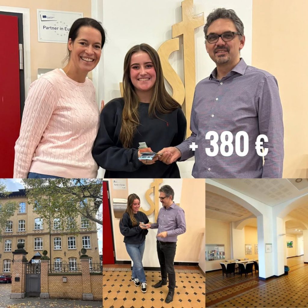 Auf dem Foto: Schulleiter Michael Roth รผbergibt die ๐ฆ๐ฝ๐ฒ๐ป๐ฑ๐ฒ๐ป๐๐๐บ๐บ๐ฒ ๐๐ผ๐ป ๐ฏ๐ด๐ฌ โฌ an Julia Sohn und Tochter Nele โ Schรผlerin am Berufskolleg, die die Aktion dort initiiert hat
